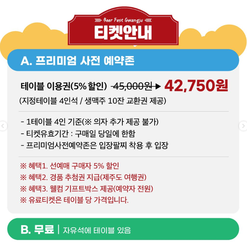 - 사전예매자 경품 추첨권 지급(제주도 여행권)• 프리미엄 사전예약존의 테이블은 한정수량으로 예약자에 한하여 지정석으로 이용가능합니다.