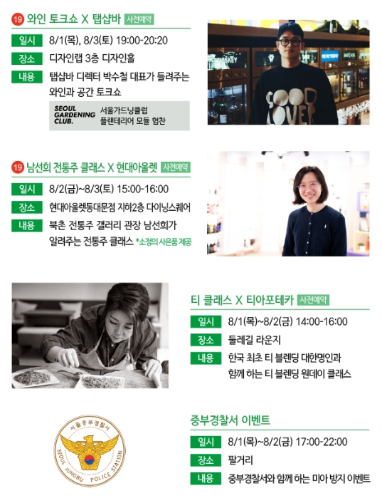 | 15:00~16:00 | 현대아울렛 동대문점 지하 2층 다이닝스퀘어 | 남선희 전통주 클래스 X 현대아울렛 | 북촌 전통주 갤러리 관장 남선희가 알려주는 전통주 클래스 *참여 특전: 현대아울렛 동대문점 2시간 무료 주차 쿠폰(비음주 가족 동반 시 증정), 소정의 사은품 |