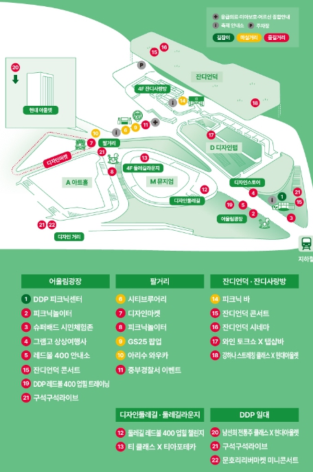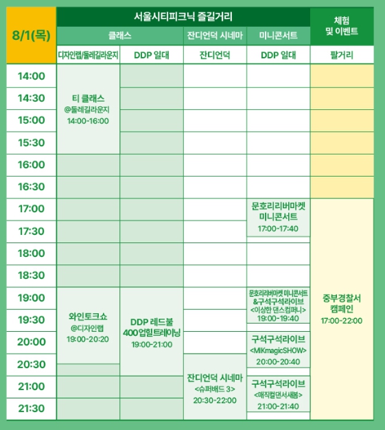| 13:00~22:00 | 어울림광장 | DDP 피크닉 센터 | 도심속 피크닉 즐기는 방법을 소개하는 DDP 피크닉 센터 (피크닉 세트 대여, 사전 예약 확인 및 현장 예약 진행, 프로그램별 안내) |